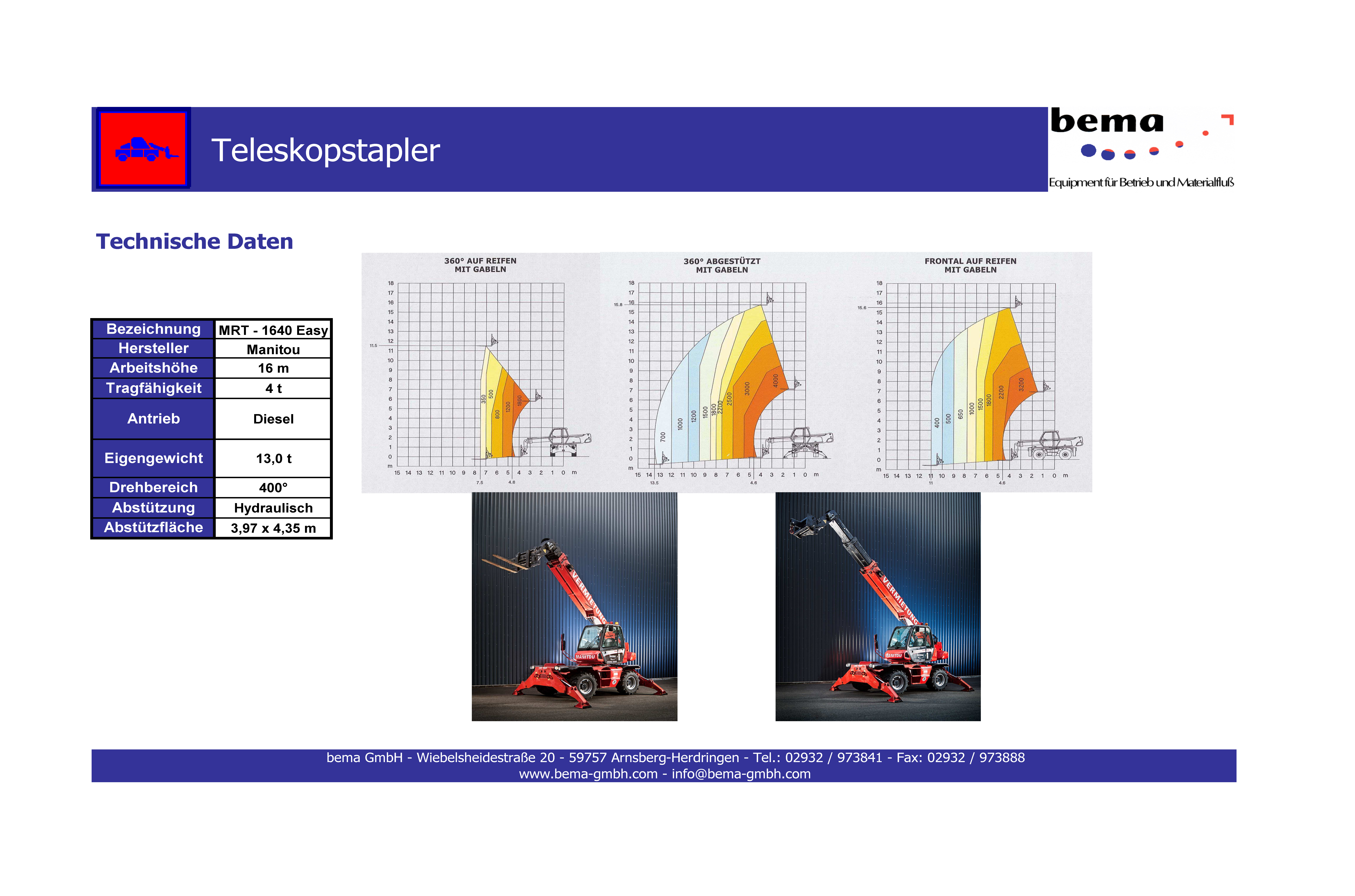 Der Teleskoplader ist ein richtig robustes Baustellengerät. Er wird überwiegend genutzt um schwere Gegenstände auf unwegsamen Gelände zu heben und zu transportieren. Der Manitou 1640 besitzt eine Tragfähigkeit von 4t und seine maximale Arbeitshöhe liegt bei 16m. Er kommt bei uns häufig bei Neu- oder Umbauten von Häusern und Hallen zum Einsatz, kann aber auch in der Land- und Forstwirtschaft treue Dienste leisten.